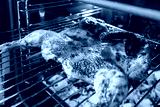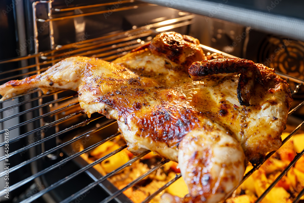 Ready-made chicken tabaka with potato cookies in the oven.