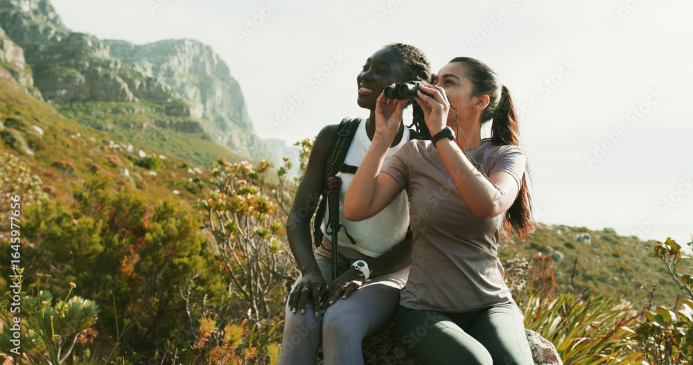 Women, friends and relax with binocular for hiking, nature sightseeing and mountain view. Happy, people and gear for travel, backpacking adventure and birdwatching observation with wildlife search