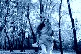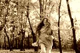 Smiling young woman plays and jumping dancing in the autumn park with the yellow leaves at sunset