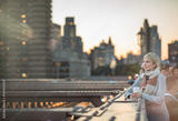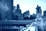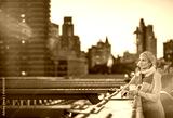 Woman on the Brooklyn Bridge Looking at Manhattan with a Coffee
