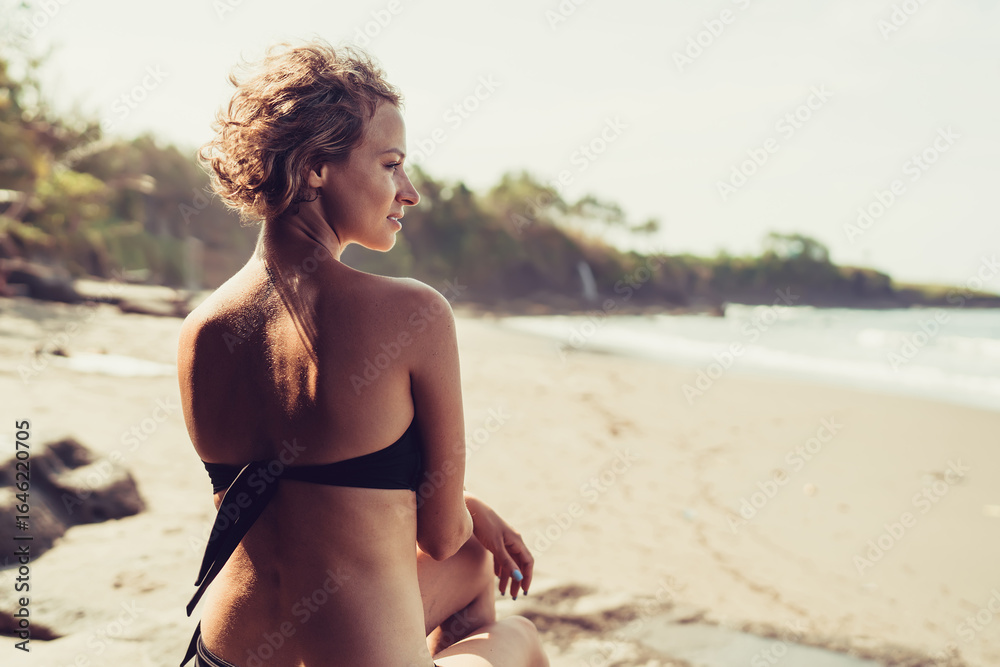 Back view of woman embracing solitude by ocean, reconnecting with self, mind and body while tuning out from constant connectivity and embracing calm awareness.