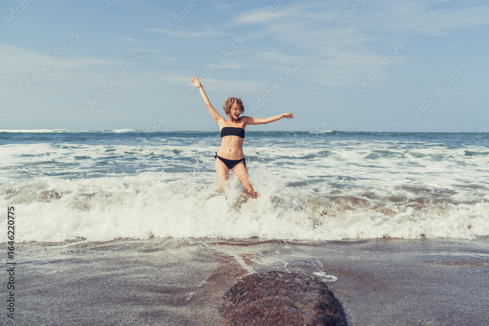 Woman joyfully jumps in foamy surf, expressing liberation, vitality and break from digital clutter to embrace fully present, sensory-rich, offline moment.