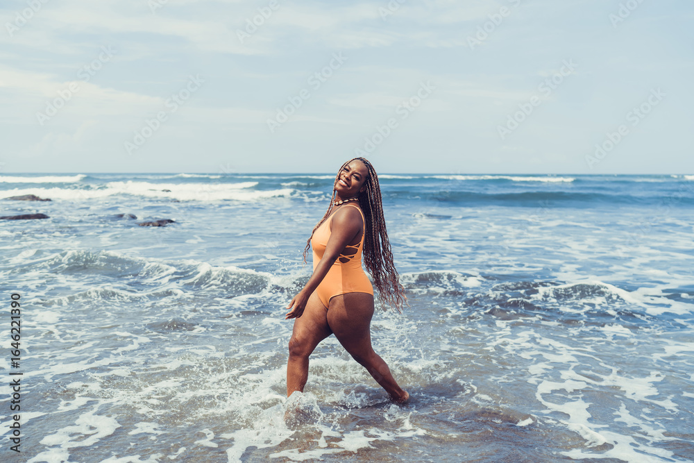 Relaxed Afro woman enjoying peaceful break by ocean, facing horizon, embodying self-care, freedom from screens, unplugged lifestyle and mindful digital disconnection.