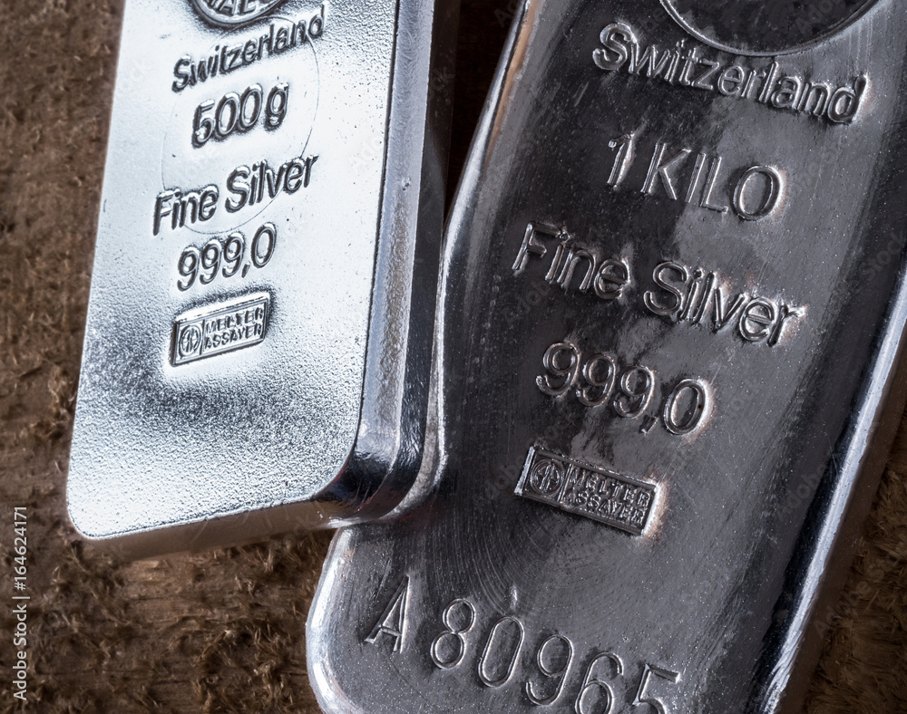 Silver bullion bars. Two fine silver bars on a.background of a rough wooden texture. .The texture of the surface of the silver ingot..