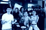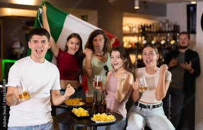 Italian fans with Italian flag emotionally watch the match on TV in a pizzeria
