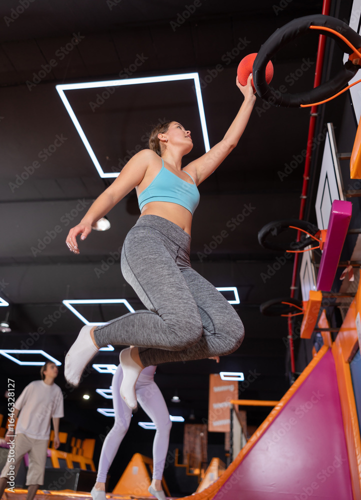 Cheerful young European female in sportswear playing basketball while bouncing on colorful trampolines indoors in leisure sports center