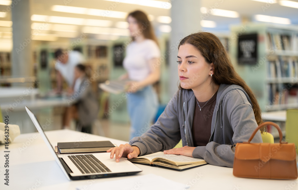 Thoughtful female student works at a music book against the background of other students in the library. Woman looks at the necessary information on the Internet