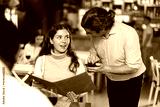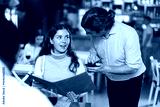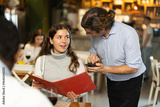 Woman, having looked at the menu, makes an order from a male waiter in a restaurant. Wife sitting at a table n front of her husband and talking about food choices with waiter in front of restaurant