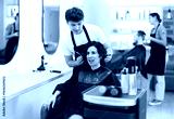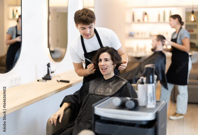 Young guy hairdresser stylist gives haircut to adult woman client in beauty salon