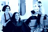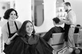 Adult female hairdresser stylist discussing haircut with young female client in beauty salon