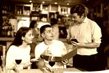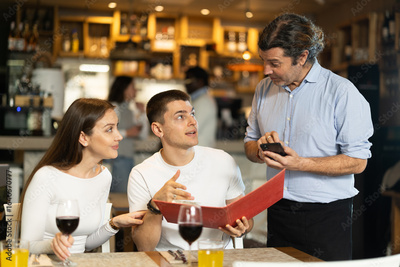 Couple came to the restaurant for the anniversary, they drink wine and consult with the waiter about the choice of food. Man and a woman ordering from a waiter in a European restaurant in winter