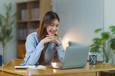 Young happy Asian woman using laptop computer and working from home, smiling and looking at the laptop screen