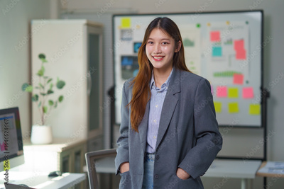 Portrait of a smiling young Asian businesswoman standing with hands in pockets in a modern office, showcasing confidence and professionalism