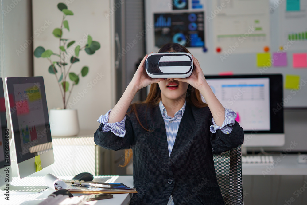 Businesswoman experiencing virtual reality using vr headset in modern office, exploring immersive technology for business applications