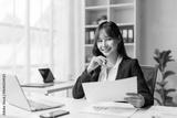 Young Asian manager working with laptop and financial documents, sitting at her desk in modern office, analyzing data and preparing report