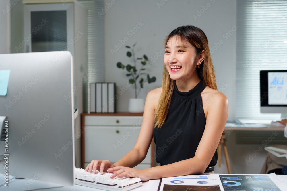 Young Asian businesswoman laughing while working with desktop computer and business charts in modern office