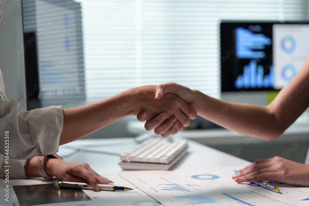Businesswomen shaking hands after successful negotiation in modern office, partnership concept