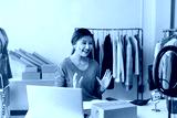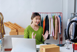 Happy young Asian entrepreneur is presenting clothes selling online using laptop and ring light streaming live video clip on social media