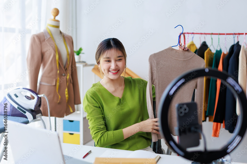 Asian fashion designer presenting new clothes during online streaming video blog from her workshop