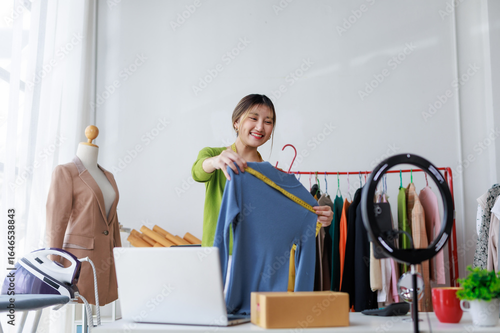 Young woman entrepreneur measuring garments in a fashion studio, preparing clothes for online sales while embracing modern digital marketing