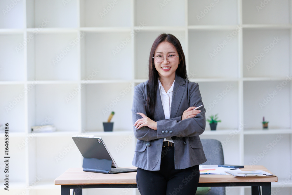 Portrait of a young Asian businesswoman smiling confidently with arms crossed in a modern office environment, exuding professionalism and success