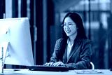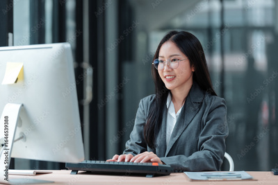 Young Asian businesswoman wearing eyeglasses and suit typing on keyboard and looking at computer screen in modern office