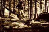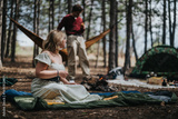 A serene camping scene featuring one person resting on sleeping gear with items around. Surrounding tall trees and hammocks enhance the natural ambiance.