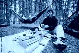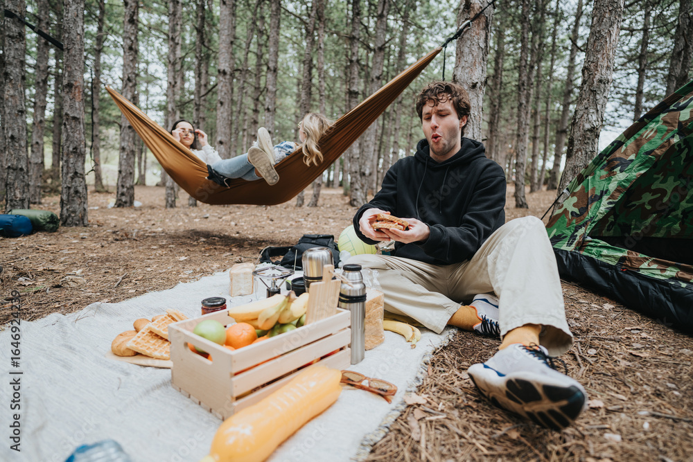 Friends gather outdoors at a serene forest location, enjoying a picnic and hammocks amidst nature.