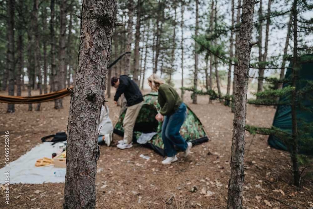 Two friends are seen preparing a campsite in a forest, setting up a tent and organizing supplies. Surrounded by green trees, they enjoy an outdoor experience, embracing adventure and nature.