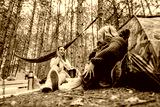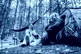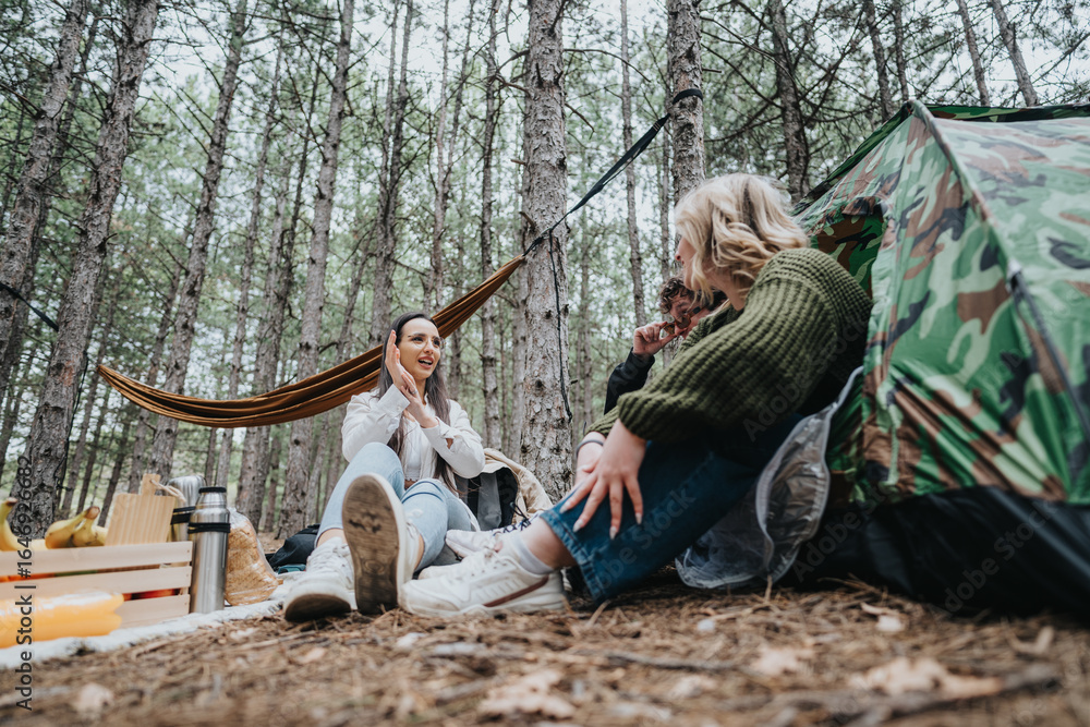 Group of friends camping in a forest, sitting by a tent and a hammock, sharing laughs.