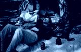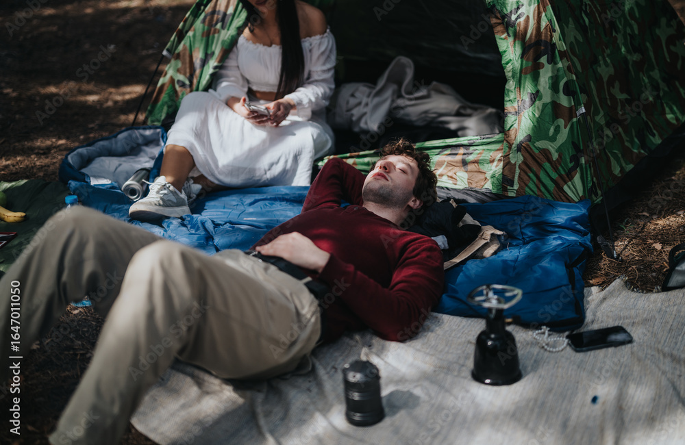 Two friends resting and enjoying a peaceful camping moment in the wilderness.