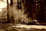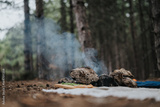 Granite rocks arranged as a campfire in a tranquil forest with light smoke.