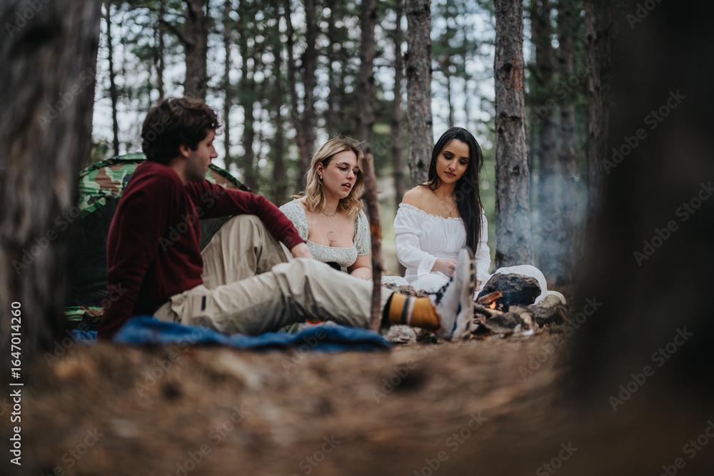 Group of friends relaxing around a campfire amidst a calm forest setting, enjoying a peaceful outdoor adventure with conversations and nature.