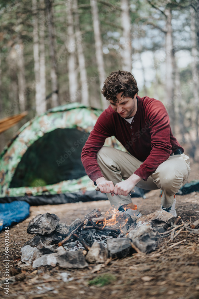 A young man crouches by a campfire in a forest clearing. Behind him, a tent and surrounding woodland convey a peaceful and adventurous outdoor ambiance, illustrating camping and connection to nature.