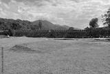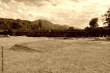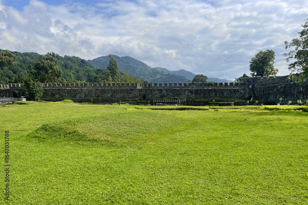 Green grass on the lawn, old fortress wall and day sky with white clouds. Beautiful landscape