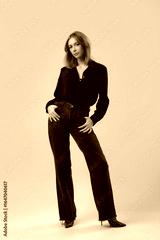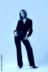 Serie of studio photos of woman in classic smart casual outfit - black denim trousers, black button down shirt and high heels.