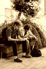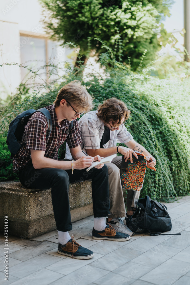 Young students sitting on a concrete bench outdoors, writing in notebooks amidst greenery. They appear focused and relaxed in a natural outdoor setting, surrounded by warm sunlight and vibrant plants.