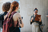 A professor holding a tablet teaches a group of students in a stimulating outdoor class.
