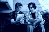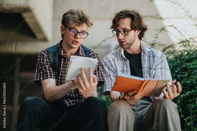 Two young students collaborate on coursework, exchanging insights and studying together in an open, outdoor space, fostering teamwork and academic success.