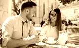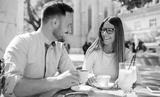 Romantic couple drinking coffee and lemonade, having a date in the cafe. Dating, love, relationships