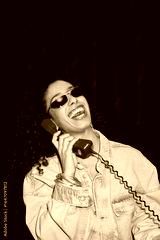 Portrait of young adult Black woman laughing with joyful expression while holding retro corded phone in photo booth, wearing sunglasses and large bracelets