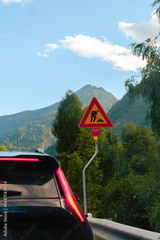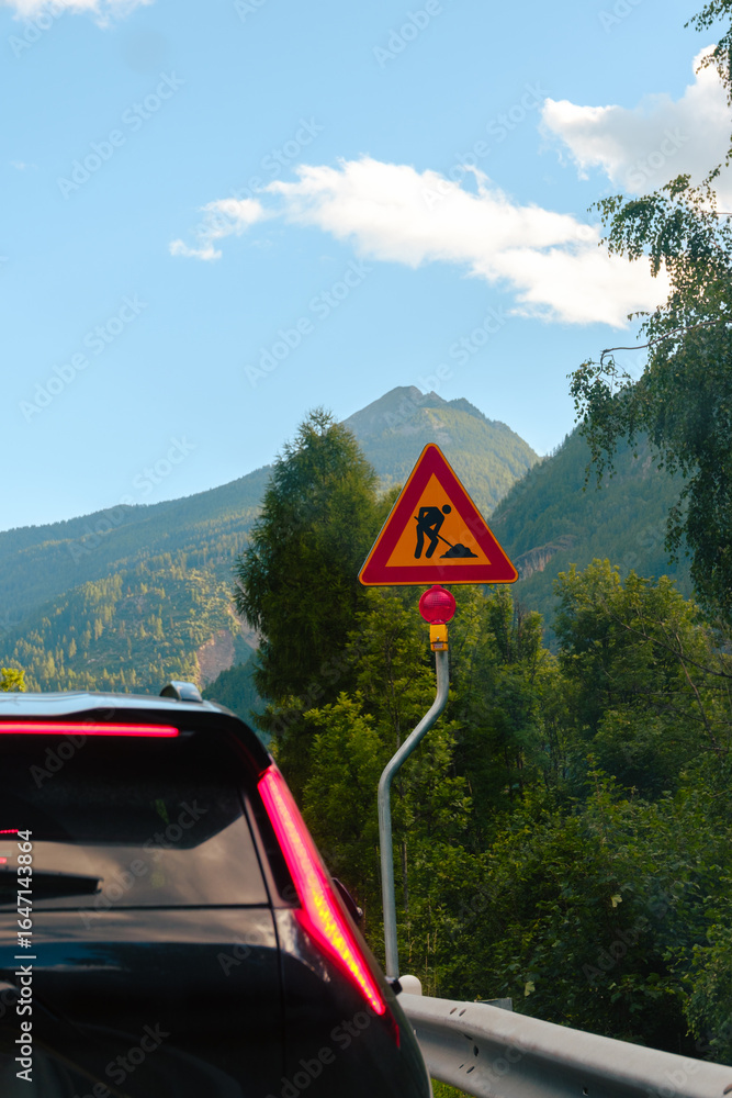 Close-up of road construction warning sign with red light beside car on mountain road surrounded by trees and hills