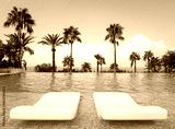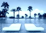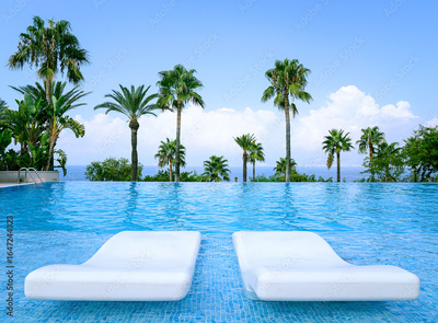 Luxurious Infinity Pool with pair loungers surrounded by palms and ocean view