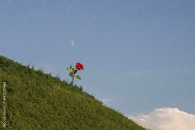 samotna czerwona róża na tle pustej łąki, nieba oraz księżyca