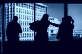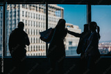 A group of professionals engaged in conversation near a large urban window, indicating teamwork and business communication.