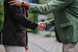 Close-up of two individuals engaged in a handshake while outdoors, emphasizing professionalism, agreement, and collaboration.