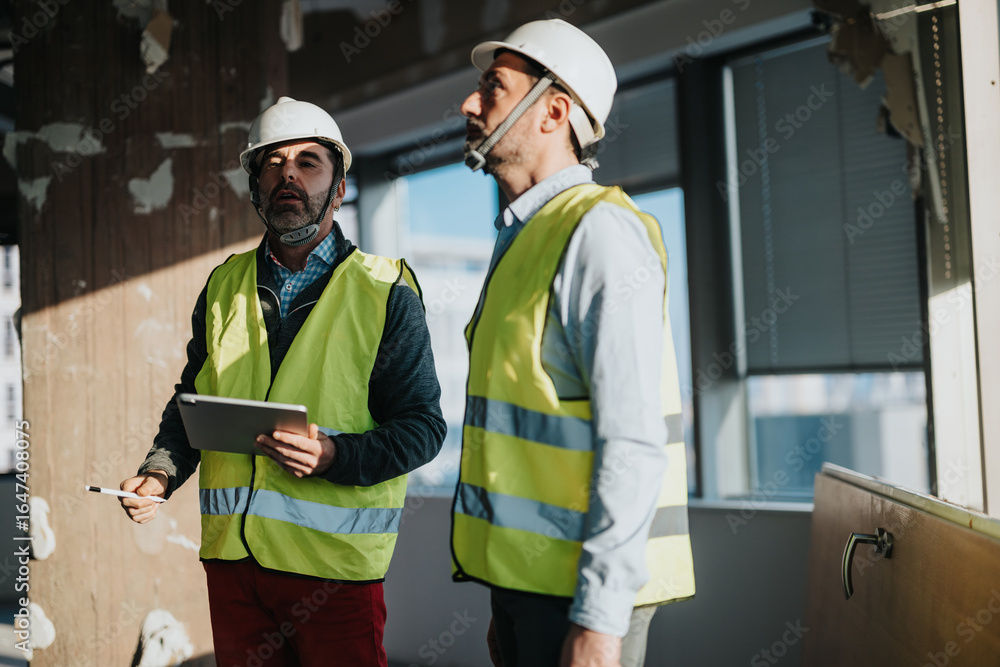 Two construction workers, wearing safety gear, analyze and plan a renovation project in an indoor construction site.
