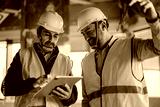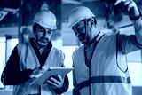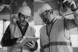 Construction team collaborating on plans using a tablet, wearing safety vests and helmets, symbolizing planning and teamwork in an industrial setting.