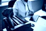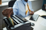 Hand of bank worker processing stack of cash using bill counting machine in office, hand inserting banknotes while sitting at desk with computer keyboard and documents visible