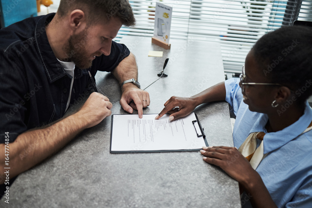 Caucasian young adult man discussing document with Black young female bank worker at office counter, both reviewing loan paperwork together, hands pointing at contract on clipboard